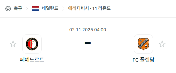 2025년 11월 02일에 열리는 에레디비시 페예노르트와 폴렌담 경기 분석입니다. 이번 경기는