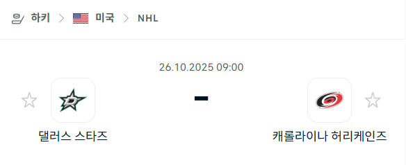 [아이스하키 NHL] 2025년10월26일 댈러스 스타스 vs 캐롤라이나 허리케인스 분석 중계