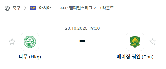 2025년 10월 23일에 열리는 AFC 챔피언스리그 2의 다푸 타이포 FC와 베이징 궈안 경기 분석입니다. 이번 경기는 홍콩 몽콕 스타디움에서 열리며, 두 팀의 맞대결은 이번이 처음입니다.