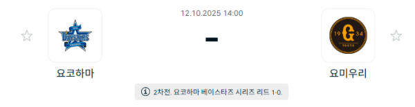 2025년 10월 12일에 열리는 일본프로야구 요코하마 DeNA베이스타스와 요미우리 자이언츠의 경기 분석입니다. 이번 경기는 포스트시즌 1차전으로, 정규시즌 맞대결에서 요미우리가 근소한 우위를 점했지만 홈의 이점을 가진 DeNA가 반격을 노리는 중요한 일전입니다. 두 팀 모두 시즌 막판 타격감이 상승세를 보이며 공격력이 어느 정도 회복된 상태지만,