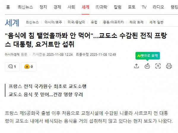 [사회] 교도소에 수감된 전직 대통령, 요거트만 섭취..