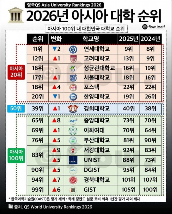 [순위] 2026년 아시아 100위 내 대한민국 대학교 순위