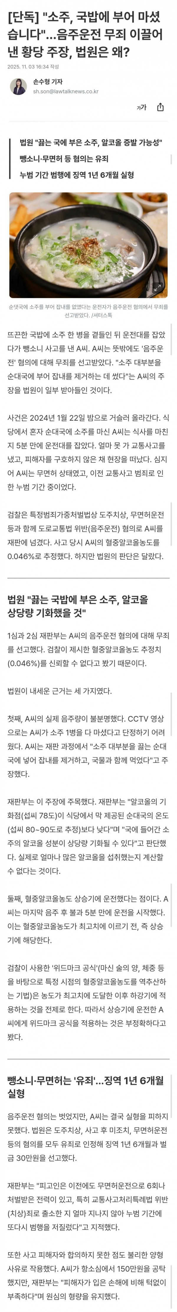 [사회] "소주, 국밥에 부어 마셨습니다"…음주운전 무죄 이끌어낸 황당 주장, 법원은 왜?