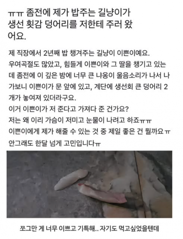 [기타] 밥 주는 길냥이가 생선 횟감 덩어리를 저한테 주러 왔어요 하....
