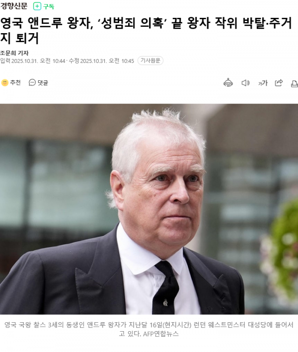 [사회] 앱스타인 연루 의혹 영국 앤드루 왕자, 칭호 박탈·저택 퇴거