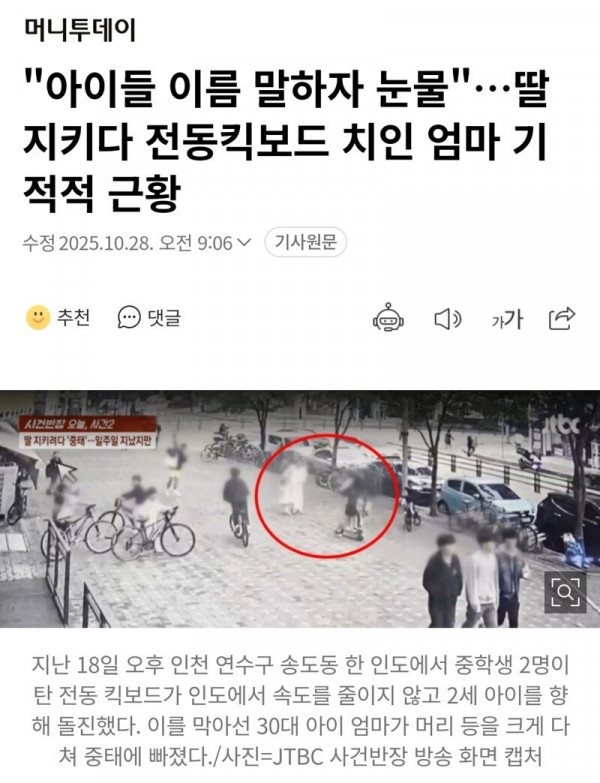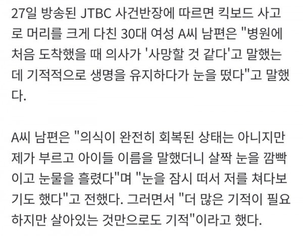 [사회] 킥보드 사고당한 2살 아이 어머니 기적적으로 눈뜨셨다고 함