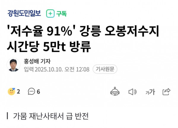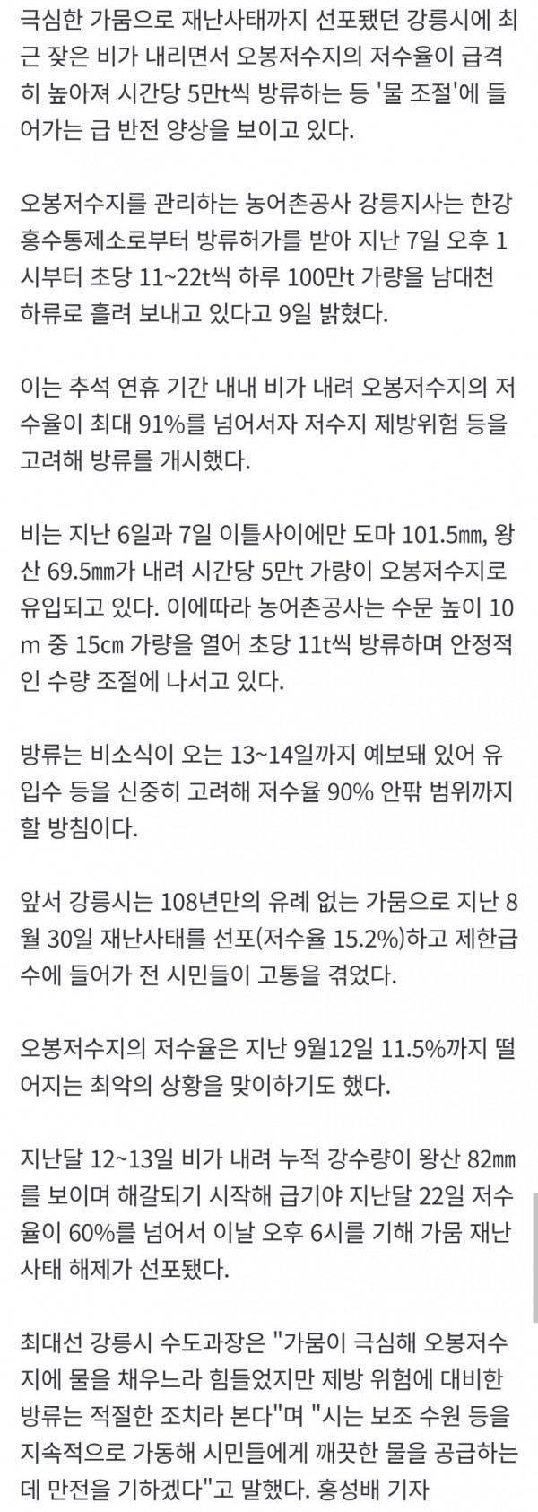 [사회] '저수율 91%' 강릉 오봉저수지 시간당 5만t 방류..news