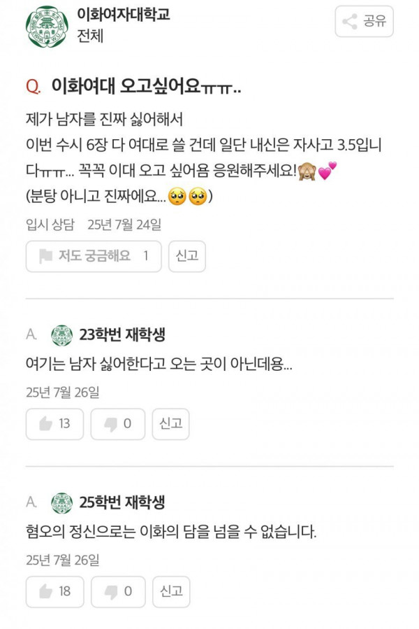 [기타] 남자가 싫어서 이화여대 가고 싶다는 학생 참교육
