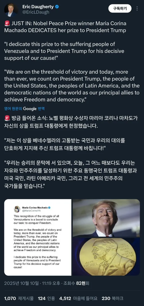 [기타] 노벨 평화상 수상자 : 이 상을 트럼프에게 바친다
