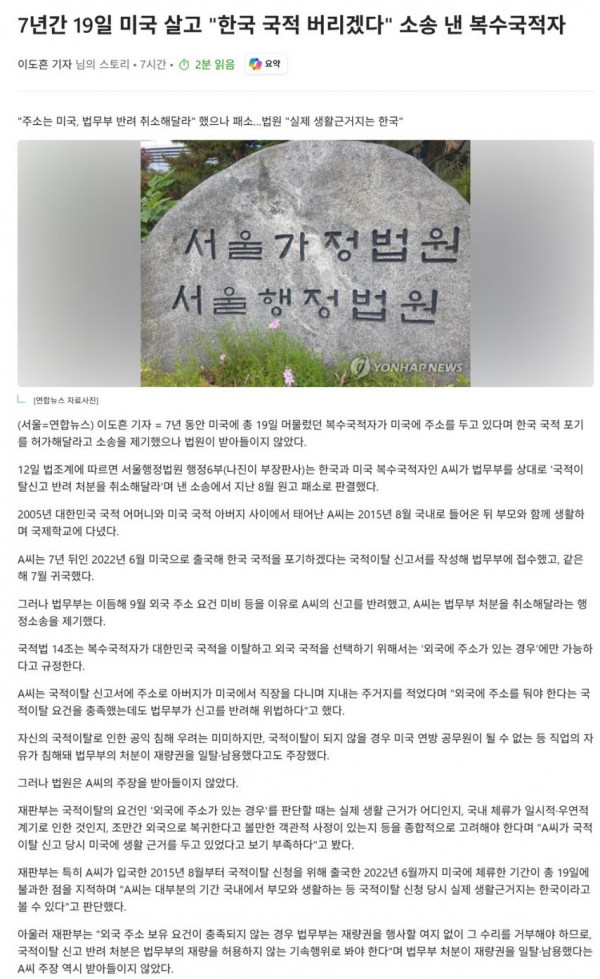 [기타] 7년간 19일 미국 살고 "한국 국적 버리겠다" 소송 낸 복수국적자