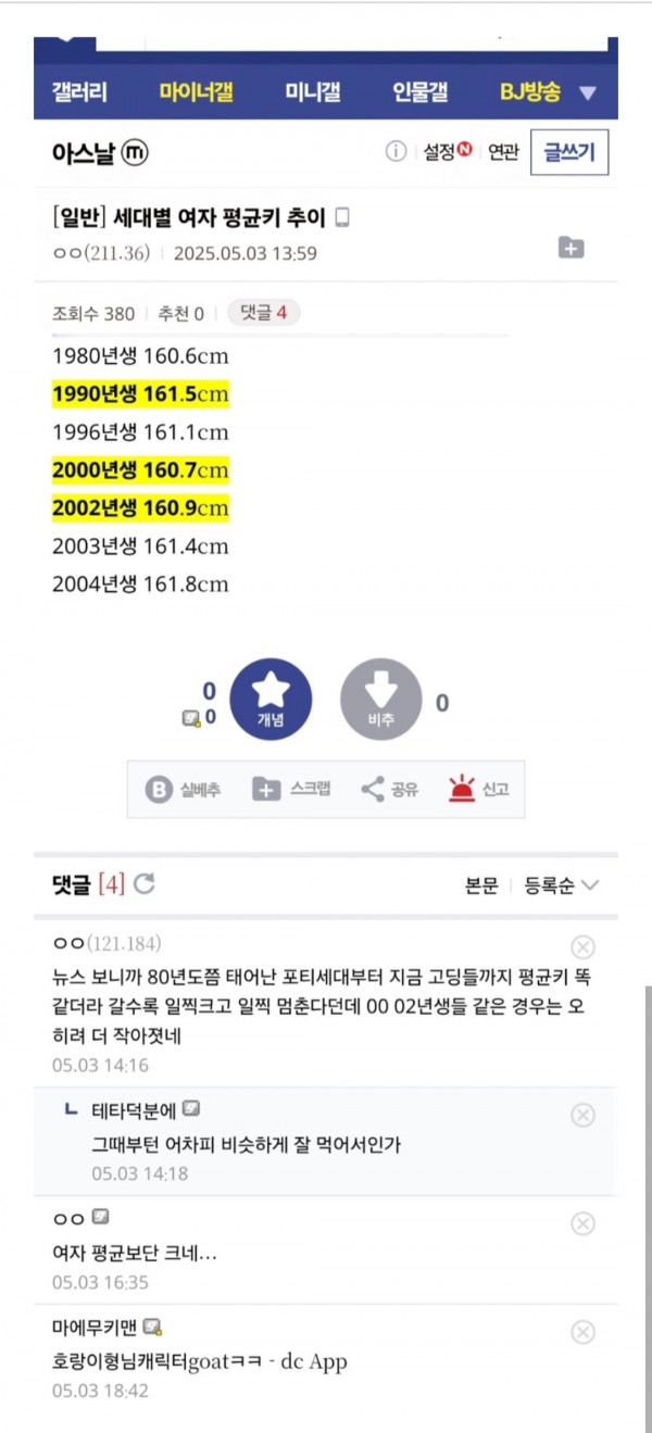 [기타] 세대별 한국 여자 평균키 추이.jpg