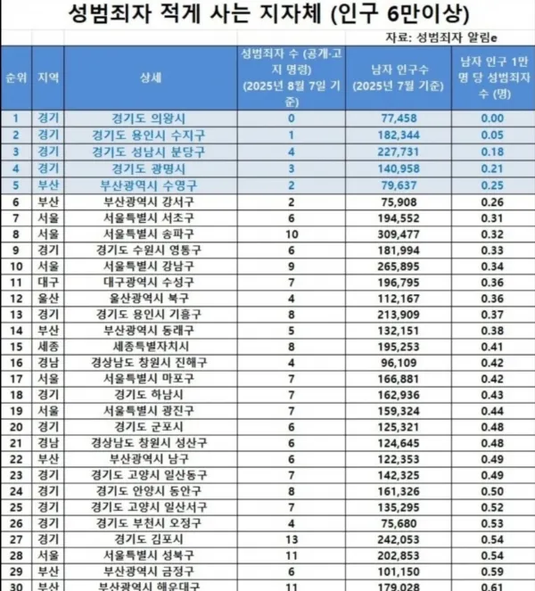 [기타] 2025년 성범죄자 많은 도시와 적은 도시