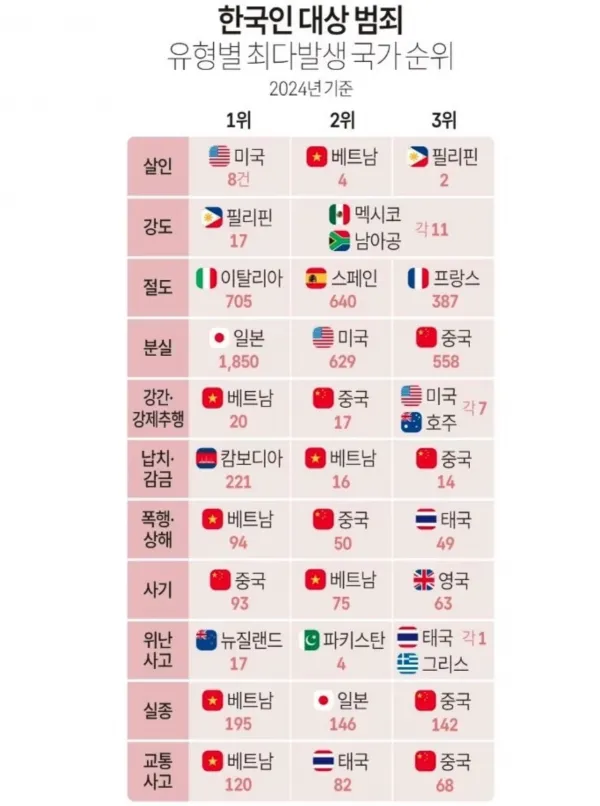 [정보] 국가별 한국인 대상범죄 순위 2024 기준