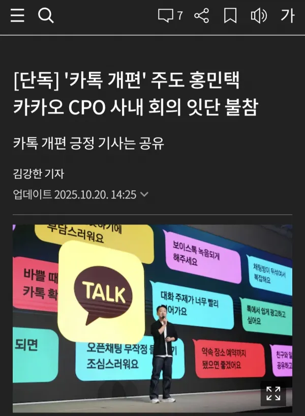 [유머] 카톡 경영진 지시: "개편 긍정 기사만 공유하고 보고 올려라"