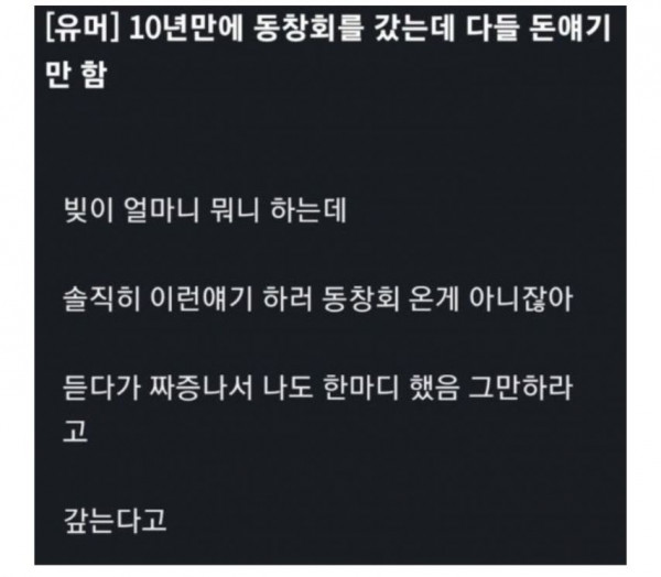 [유머] 10년만에 동창회 갔는데 다들 돈얘기만 함
