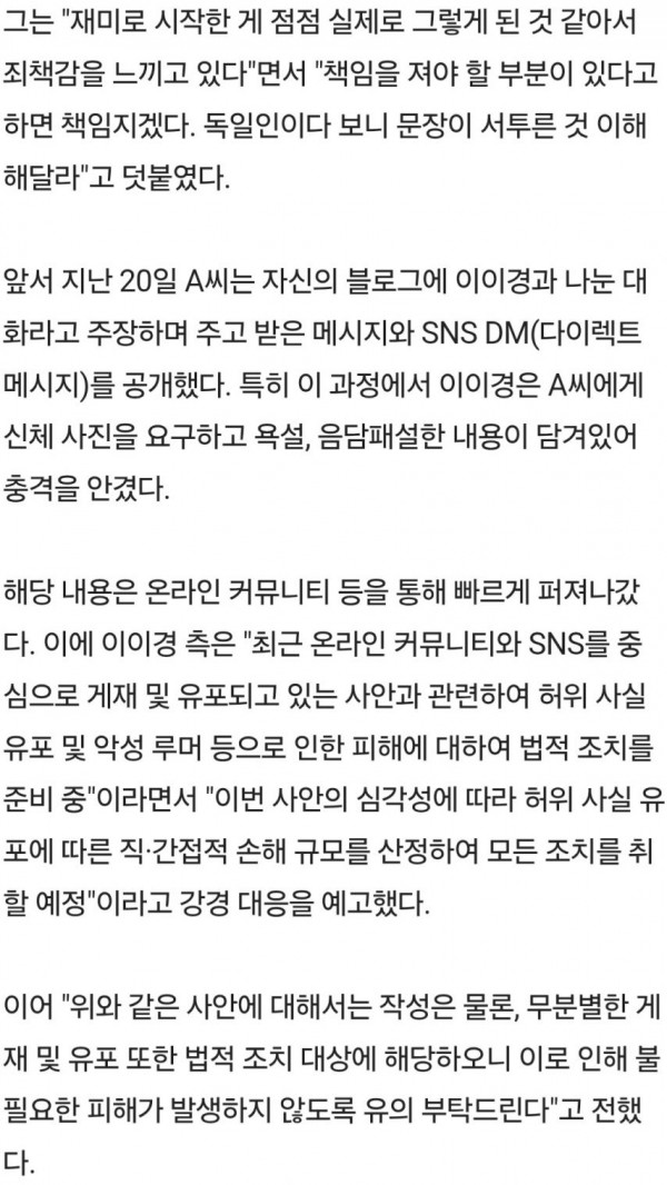 [엽기] 이이경 사생활 폭로자, 돌연 사과 "AI 사진 장난…관심 받을 줄 몰랐다"