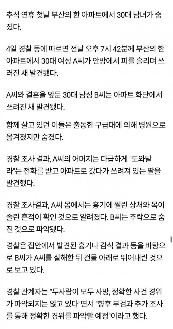 [사회] 연휴 첫날 결혼 앞둔 30대 남녀 사망…경찰 수사 중