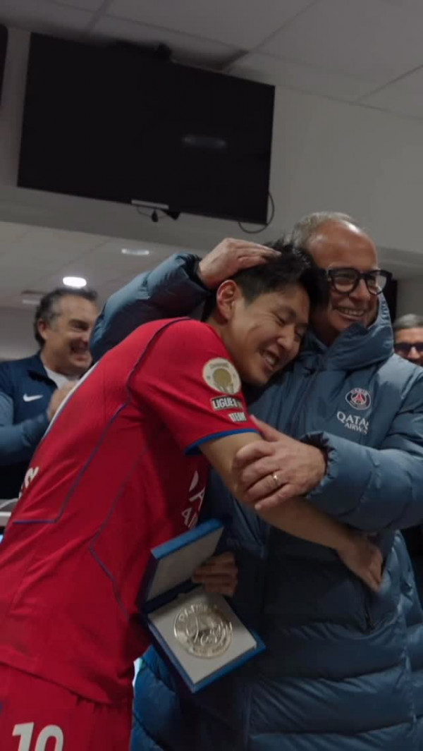 PSG 이강인이 10일 리옹과의 리그1 경기서 승리한 뒤 PSG 소속 공식전 100경기 출전 기념 메달을 받고 루이스 캄포스 단장과 포옹하고 있다. 사진=PSG SNS