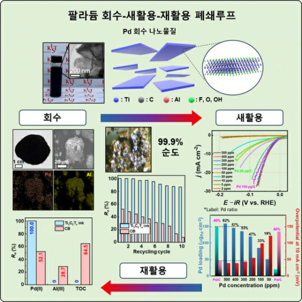 연구팀은 나노소재 표면에 비포화 산소를 가진 ‘맥신물질 나노클러스터’를 고밀도로 배치해, 기존 방식으로는 회수가 어려운 약산성 환경에서도 30분 만에 99.9%의 팔라듐을 고순도로 회수하는데 성공했다.