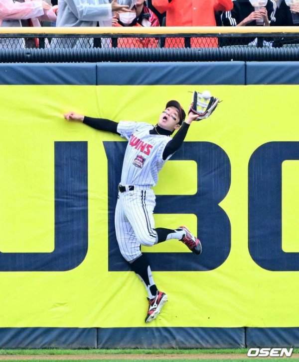 의 장타성 타구를 펜스 앞에서 점프 캐치하는 장면. 환상적인 수비 하나로 경기 분위기를 바꾼 그는 단순한 호수비를 넘어, 우승 향방을 결정짓는 장면을 만들어냈다. 이 장면은 팬들 사이에서 ‘대전 명물 성심당 출입 금지’라는 유쾌한 농담까지 불러일으키며 박해민 특유의 존재감을 다시 한번 각인시켰다.