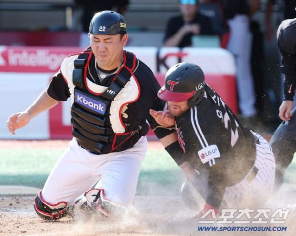18일 수원 케이티위즈파크에서 열린 KT와 LG의 더블헤더 1차전 경기. 5회초 2사 2루. 오지환 안타 때 2루주자 오스틴이 홈으로 쇄도했으나 태그아웃을 당하고 있다. 수원=송정헌 기자[email protected]/2025.09.18/