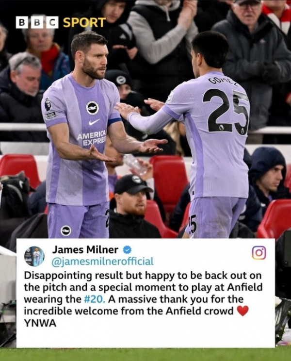 밀너는 2023년 브라이튼으로 이적했으나, 구단에 헌신했던 그를 많은 리버풀 팬들이 그리워했다. 밀너 역시 리버풀에 대한 애정이 각별했다. 특히 지난 여름 디오구 조타가 안타까운 교통사고로 사망하자, 밀너는 그를 기리기 위해 자신의 등번호를 조타의 20번으로 변경하며 리버풀 팬들과 슬픔을 나누기도 했다.