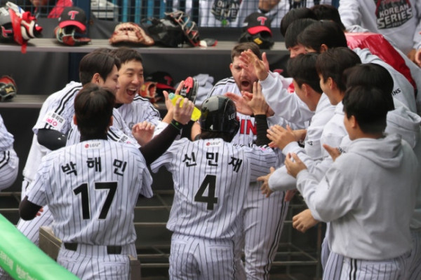 LG '분위기 좋고' (서울=연합뉴스) 서대연 기자 = 26일 서울 잠실야구장에서 열린 2025 프로야구 한국시리즈 1차전 한화 이글스 대 LG 트윈스 경기. 1회말 2사 3루 LG 문보경의 1타점 적시타에 홈으로 들어온 3루주자 신민재가 더그아웃에서 환영받고 있다. 2025.10.26 [email protected]/2025-10-26 14:35:28/ <저작권자 ⓒ 1980-2025 ㈜연합뉴스>