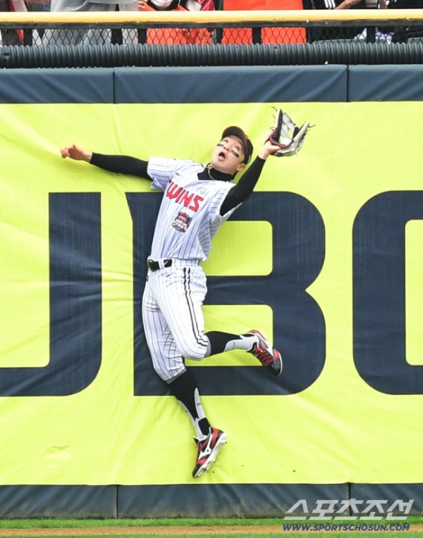 하지만 그 자리에는 '수비의 신' LG 중견수 박해민이 있었다. 전력으로 후진해 펜스 바로 앞에서 마지막 순간 점프하며 글러브에 공을 담았다.