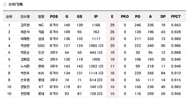 물론 이닝이 압도적이긴 했지만 전체 수비 실책 7위 ,,,