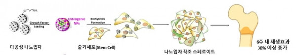 이 과정에서 나노입자는 줄기세포 사이에서 지지체 역할뿐 아니라, 뼈 형성을 촉진하는 신호물질을 실고 서서히 방출한다.
