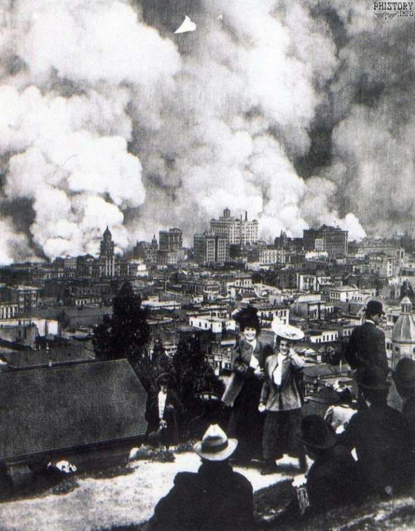 여성들이 지진으로 인해 발생한 화재를 배경으로 사진을 찍고 있습니다. 샌프란시스코, 캘리포니아 주. 1906년 4월 18일.