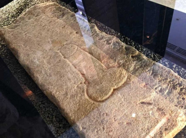 출처와 의미가 알려지지 않은 큰 상징이 새겨진 로마식 포장도로가 자다르 고고학 박물관에 전시되어 있습니다.