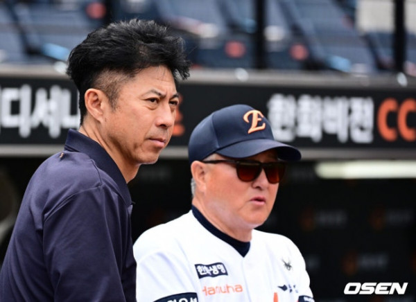 [OSEN=대전, 지형준 기자] 한화 손혁 단장과 김경문 감독이 이야기를 나누고 있다. 2025.06.14 /[email protected]