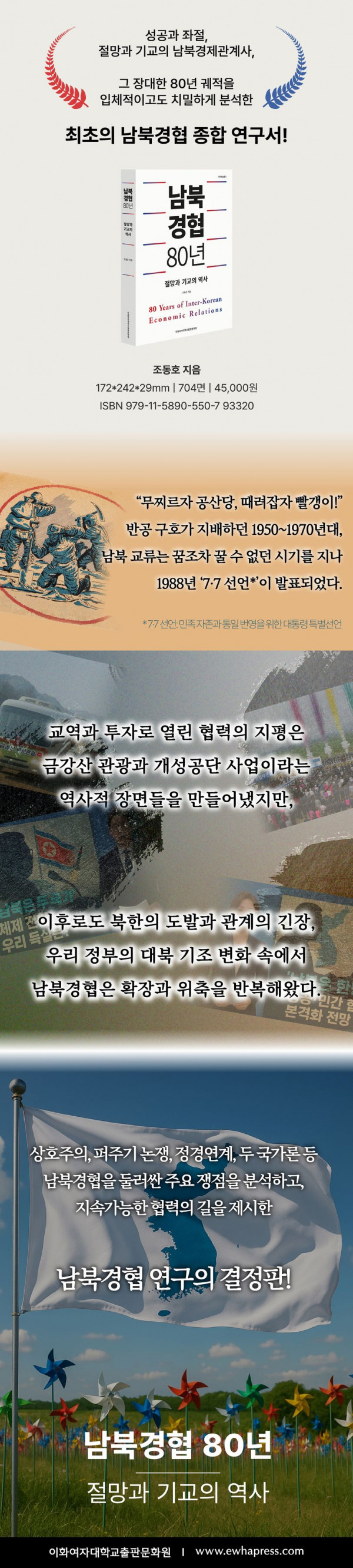 북한경제 전문가인 저자는 “절망이 기교를 낳고, 기교 때문에 또 절망한다”는 시인 이상(李箱)의 말을 빌려 “남북경협의 역사 역시 절망과 기교의 경로를 밟아오고 있다”고 진단한다. ‘7ㆍ7 선언’이든 ‘햇볕정책’이든 ‘10ㆍ4 선언’이든, 정부의 의지에만 기댄 대북정책은 경협 문제의 근본적인 해결책이 되지 못하고 한낱 ‘기교’에 머물 뿐이며, 결국은 좌초되어 절망만을 되풀이하게 만들 뿐이라는 지적이다. 그러면서 무조건적인 ‘퍼주기’도, 맥락 없는 ‘안 주기’도 아닌, 원칙과 전략이 있는 ‘잘 주기’의 시대로 나아가기 위한 실마리를 제시한다. 정책 입안자나 실무자, 연구자, 기업인, 학생은 물론이고 남북관계에 관심이 있는 독자라면 누구든 이 책을 통해 남북경협의 궤적과 향후의 가능성을 가늠해볼 수 있을 것이다. 숱한 변화로 점철된 지난 80년의 흔적을 되짚는 작업이, 다시 이어질 미래의 방향을 찾기 위한 중요한 이정표가 되기를 기대한다.