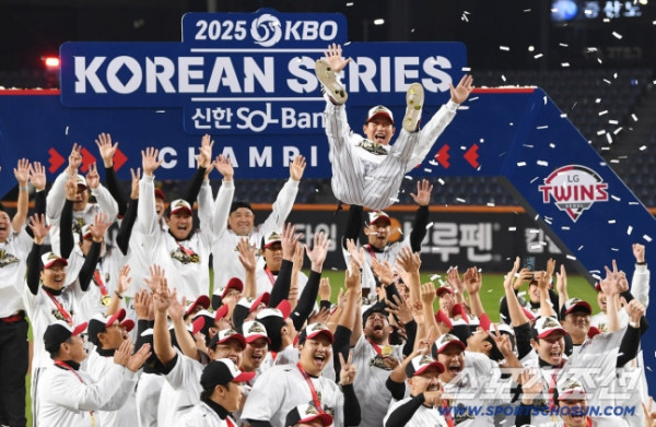 31일 대전 한화생명볼파크에서 열린 LG와 한화의 한국시리즈 5차전. LG가 4대1로 승리하며 시리즈 전적 4승 1패로 우승을 차지했다. 선수들이 염경엽 감독을 헹가래 치고 있다. 대전=정재근 기자 [email protected]/2025.10.31/