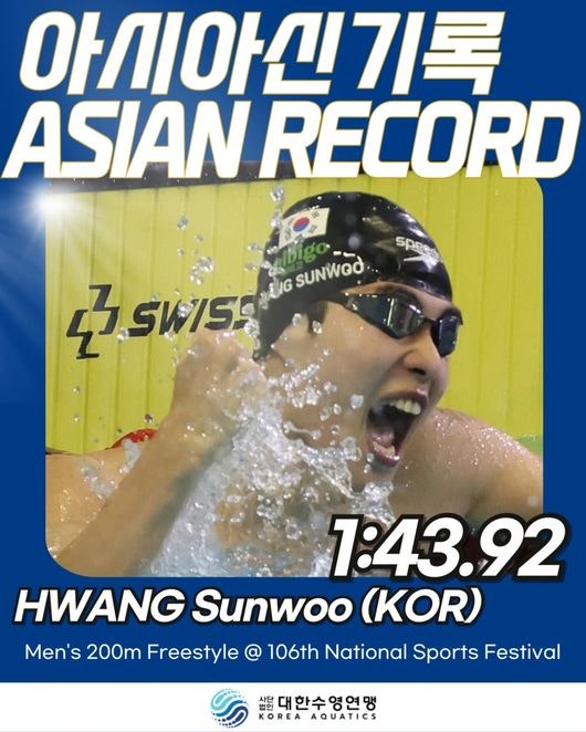 아시아 신기록도 탄생했다. 황선우는 이번 기록으로 자신이 2023년 항저우 아시안게임에서 세웠던 한국 기록(1분44초40)을 0.48초 앞당겼고, 쑨양(중국)이 갖고 있던 아시아 기록(1분44초39)도 갈아치웠다.