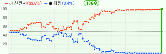 신진서 9단은 적극적인 수로 상대가 쉽게 갈 수 없는 상황을 유도했다. 최정 9단은 좌상에서 과감한 결단으로 힘을 내기도 했으나 이어진 하변 접전에서 승률 그래프가 크게 떨어졌다. 후반 들어서는 최대한 집으로 버틴 신진서 9단, 반격의 기틀을 마련하지 못한 최정 9단.