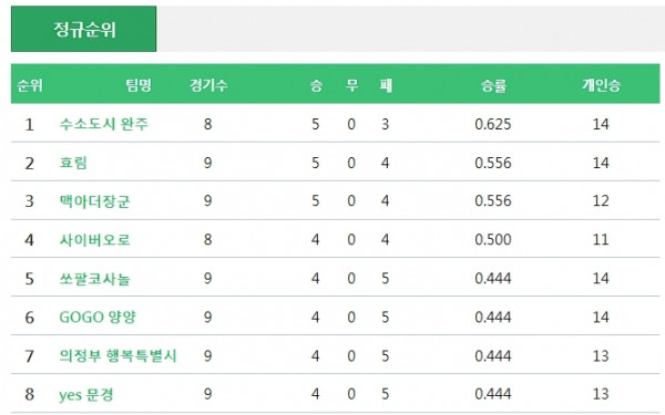 | 순위 | 팀 | 경기 | 승 | 무 | 패 | 승점 |