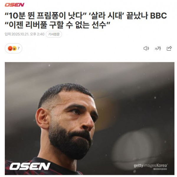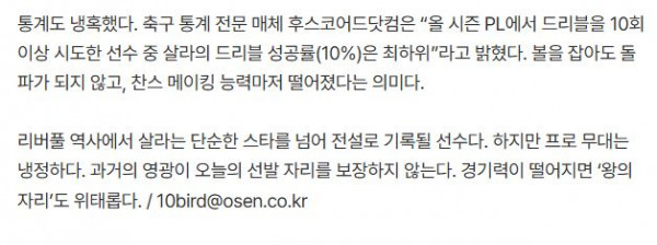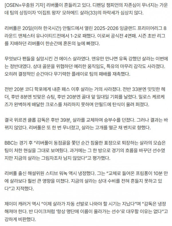 “10분 뛴 프림퐁이 낫다” ‘살라 시대’ 끝났나 BBC “이젠 리버풀 구할 수 없는 선수”