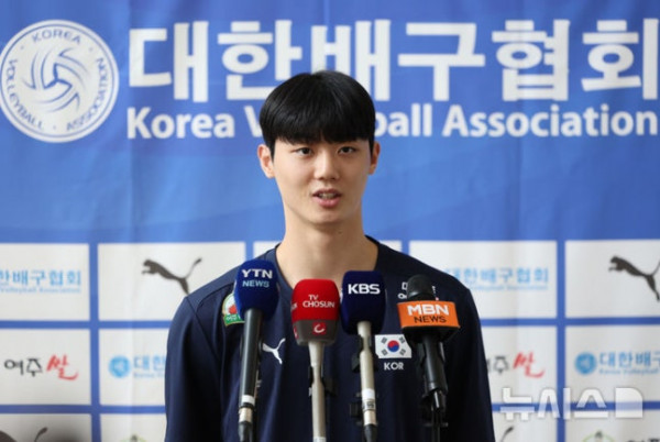 [진천=뉴시스] 황준선 기자 = 대한민국 남자 배구 국가대표팀 이우진이 23일 오후 충북 진천군 진천국가대표선수촌에서 열린 대한민국 배구 국가대표팀 공개훈련에서 취재진과 인터뷰를 하고 있다. 2025.05.23. [email protected]