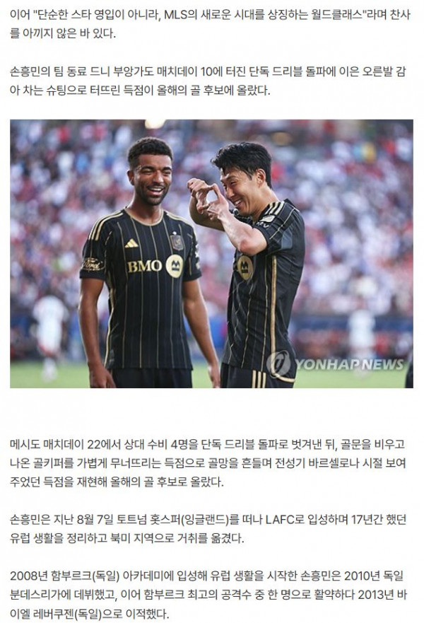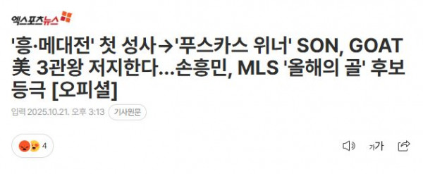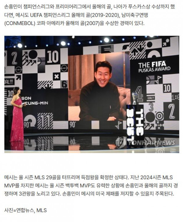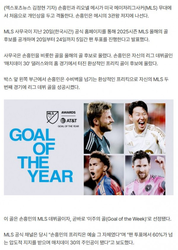 '흥·메대전' 첫 성사→'푸스카스 위너' SON, GOAT 美 3관왕 저지한다…손흥민, MLS '올해의 골' 후보 등극 [오피셜]