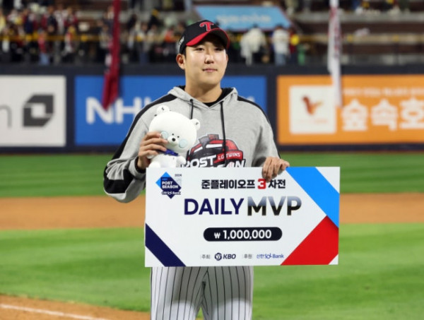 11일 오후 잠실야구장에서 열린 KT위즈와 LG트윈스의 2024 신한쏠뱅크 KBO포스트시즌 준플레이오프 5차전. LG가 4-1 승리, 플레이오프에 진출했다. 경기종료후 시상식에서 LG 손주영이 데일리 MVP를 받고있다. 잠실=정시종 기자 [email protected] /2024.10.11.