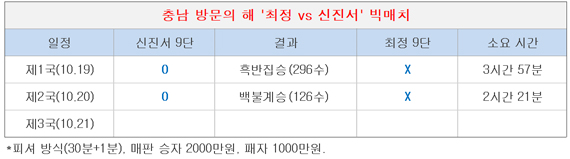 종합 결과에 관계없이 판당 승패에 따라 다른 상금을 놓고 세 차례 대국을 벌이는 보령 빅매치는 2국에서도 신진서 9단이 최정 9단을 꺾었다.