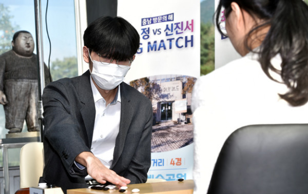 충남 방문의 해를 맞아 보령시의 관광 명소를 순회하는 3번기는 20일 오후 개화예술공원 내의 모산미술관에서 둘째 판을 치렀다. 다시 돌을 가린 결과 최정 9단의 흑으로 시작한 바둑은 126수 만에 신진서 9단의 불계승으로 끝났다.