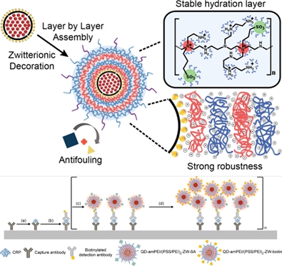 QDCC의 구조 및 신호가 강화된 것은 ‘층상 자기 조립’이라는 방식 때문이다. 층상 자기 조립을 적용하면 외부 물질 때문에 신호가 약해지는 현상인 ‘형광 소광’이 최소화된다. 연구팀은 층상 자기 조립을 통해 나노입자의 표면 화학 구조를 정밀하게 조절하고 생체분자(비오틴, 스트렙타아비딘 등)를 표면에 도입한 뒤 나노입자와 생체분자 간 상호 결합력을 극대화시켰다.