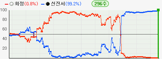 대국 개시 3시간 30분, 223수째에 승률 그래프의 방향이 교차했다. 마지막 공배를 메운 시각은 4시 57분. 오후 1시부터 3시간 57분, 296수를 두었다. 종국 시 신진서 9단은 1시간 20여분을 남겼다.