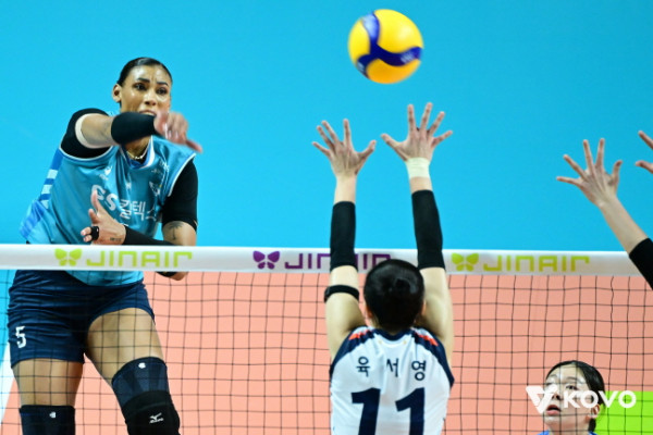 GS칼텍스 실바(왼쪽)가 2명의 블로커를 앞에 두고 과감한 공격을 시도하고 있다. /사진=KOVO 제공