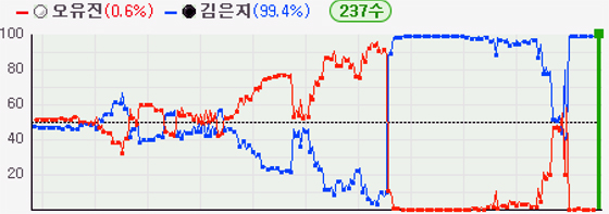 이 바둑을 중계한 이희성 해설자의 총평이다. 단 한수로 오유진의 97%가 김은지의 96%로 뒤집어졌고, 김은지가 99.9%를 찍었던 승률이 다시 역전되기도 했는데 오유진이 냉정하지 못했다.