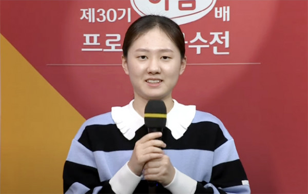 "첫 결승 진출이라 너무 기쁘다. 운이 많이 따랐다"는 김은지 9단은 "(최정 9단과의) 첫 결승에서는 많이 부족한 때라서 승부가 안 됐는데 요즘은 팽팽하게 흘러가다가 지는 흐름이라 부족한 부분을 보완하면 잘될 수 있을 것 같다. 그 전의 결승과는 다른 마음가짐으로 잘 싸워 보겠다"고 각오를 밝혔다.