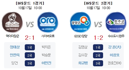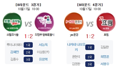 17일 오전 10시 한국기원 2층 대회장과 바둑TV 스튜디오에서 일제히 8라운드를 치른 결과 네 경기 모두 2-1 스코어로 결말이 나는 가운데 위아래로 순위표가 크게 출렁였다.